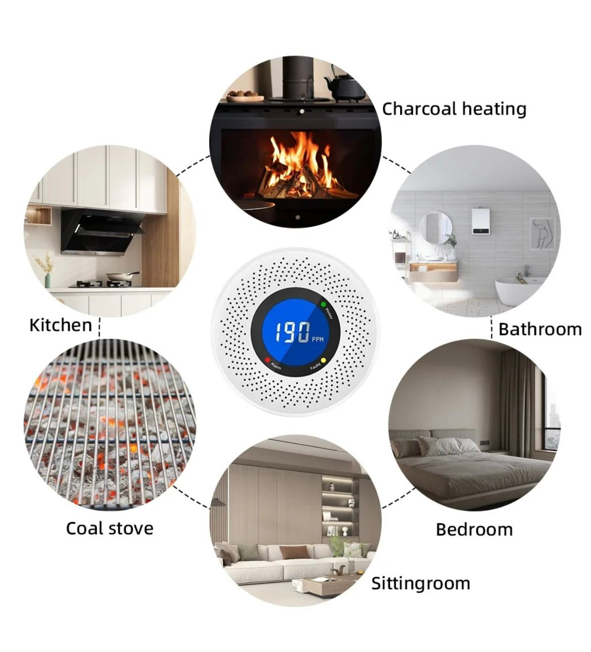 Detector independent de monoxid de carbon : Este un detector electrochimic de CO de inalta sensibilitate si este utilizat pe scara larga pentru detectarea gazului de monoxid de carbon (CO). CO este un tip de gaz toxic incolor, fara gust, neiritant si imperceptibil, produs de obicei in medii de ardere cu oxigen insuficient, cum ar fi seminee, lemne, carbune, incalzitoare electrice si incalzitoare de apa. Prin urmare, pentru a asigura siguranta locuintei, se recomanda instalarea detectorului de CO in bucatarii, bai, camere de zi si alte spatii in care aerul nu este bine ventilat pentru o perioada lunga de timp.
