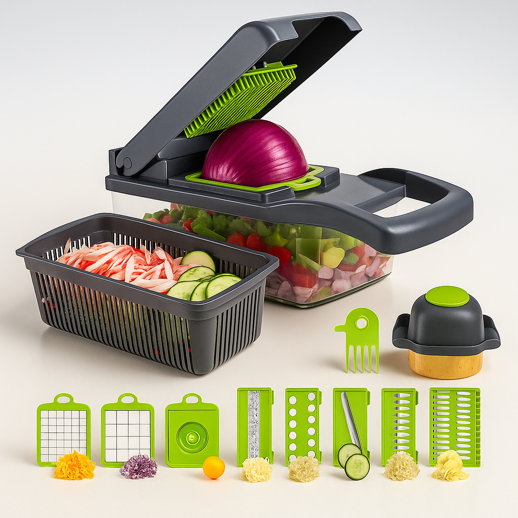 – Razatoarea multifunctionala pentru legume cu 7 accesorii interschimbabile.